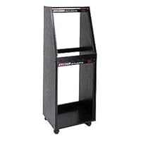 The Raxxess ER1216 Sloped Studio Rack is an economy rack constructed with heavy duty 3/4-inch medium density fiberboard and attractively finished with a black oak laminate. It is shipped knocked down and assembles in minutes with the hardware kit provided. Rack rail included is of 11-gauge, cold rolled steel. Furniture grade casters are standard equipment on this slant rack. A great combination of form and function. AmericanMusical.com is an authorized dealer of Raxxess products.