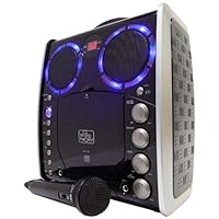 Take the karaoke party on the go with the Singing Machine portable karaoke machine (model SML-383), which features a built-in disco light system to enhance the party atmosphere wherever you roam. The SML-383 features a vertical loading CDG player, two microphone jacks with separate volume controls (great for singing duets), and a video output for simple connection to a TV or HDTV (for displaying lyrics). And the disco light mode lets you enjoy several flashing effects. Other features include built-in speakers, balance and echo control, and auto voice control. It comes with a free CDG music sampler and one microphone to get you started.
